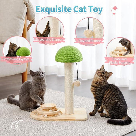 Made4Pets Cat Scratching Post, Mushroom Cat Scratcher with Sisal Ropes, Interactive Track Ball Toy, 2-In-1 Wood Scratch Cattree